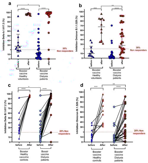 Before receiving the first booster, 10 out of 34 dialysis patients (29.4%) and 8 out of 12 (66.7%) controls had neutralizing antibody activity against the Delta variant (p = 0.023). After the booster, 91.2% (31 patients) of the dialysis group and 100% of the control group were above the threshold of 20% inhibition (Figure 4a,c).