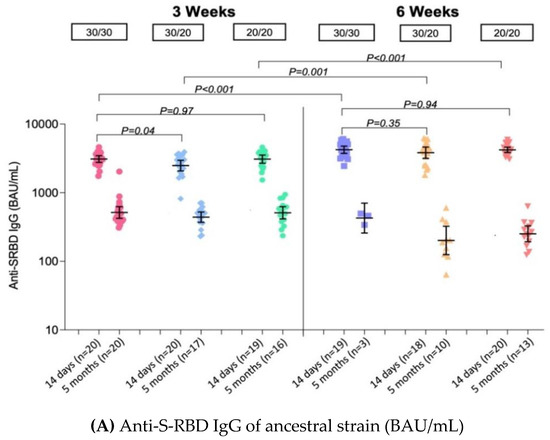 The GMs of anti-S-RBD IgG are shown in Table 1 and Figure 3A. After completion of the primary series vaccination, the GMs of anti-RBD IgG of SARS-CoV-2 ancestral strain were 3090 BAU/mL (95% CI 2761–3460) among adolescents who received the standard regimen of BNT162b2, 3wPZ30/30. In the fractional dose groups with a 3-week interval, the GMs were 2480 BAU/mL (95% CI 2078–2961) and 3080 BAU/mL (2685–3535) among 3wPZ30/20 and 3wPZ20/20 groups, respectively. The GMRs were 0.80 (95% CI 0.67–0.97) and 1.00 (95% CI 0.83–1.20) when compared to the standard regimen. The GMs of anti-S-RBD IgG were significantly higher among extended 6-week-interval groups, which had a GMR of 1.37 (95% CI 1.13–1.65) in 6wPZ30/30, 1.24 (95% CI 1.02–1.50) in 6wPZ30/20, and 1.36 (1.13–1.64) in 6wPZ20/20. There is no difference in the GMs of anti-S-RBD IgG across genders (p-value 0.94).