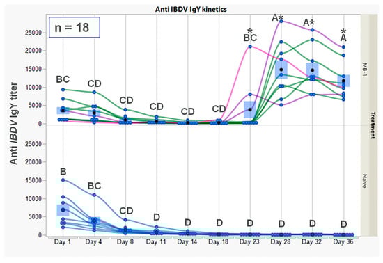 Serum anti-IBDV IgY kinetics in vaccinated and naïve broiler chicks, following vaccination at 1 DOA with MB-1 vaccine. Antibody titers were obtained using the IDEXX IBD-XR Ab ELISA test. Each blue point represents an individual chick at a specific time point. For vaccinated chicks only, green lines represent chicks with relatively high anti-IBDV MDA, while pink and purple lines represent chicks with relatively low anti-IBDV MDA (each line stands for repeated measures of the same chick). For each time point and treatment, blue bars represent the mean ± SEM of 9 individual chick measurements. A two-way ANOVA model in a repeated measurements design was used to determine the significance of differences between group mean values; groups or days headed by different letter combinations are significantly different (p < 0.05). For days 23–36, due to heterogeneity of variance between groups within days, the significance of differences between groups’ mean values was determined via Welch-t-test (p < 0.05); differences were marked using asterisks *.