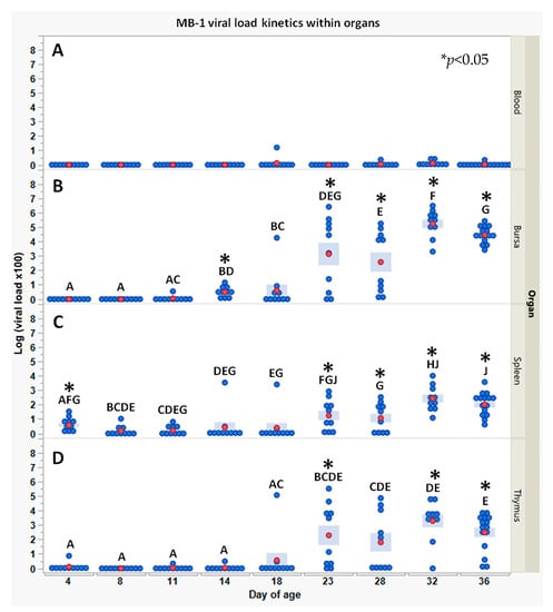 MB-1 viral load kinetics within the blood (A), bursa (B), spleen (C), and thymus (D) in vaccinated chicks, following 1 DOA vaccination with MB-1 vaccine; in all naïve chicks, viral load was 0 (data not shown). Viral loads were obtained using qPCR and translating Cq values using a known MB-1 standard (as described in the Section 2). Each blue point represents an individual chick at a specific time point. For each time point and organ, red points and blue bars represent the mean ± SEM of 10 individual chick measurements (15 measurements at 36 DOA). Due to heterogeneity of variance between days, the significance of differences between days’ mean values was determined via non-parametric Wilcoxon each paired test; days headed by different letter combinations are significantly different (p < 0.05). The significance of differences between groups within days’ mean values was determined via Welch-t-test (p < 0.05); differences were marked using asterisks *.