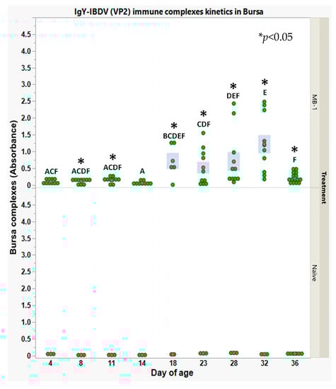 IgY-IBDV immune complexes kinetics within bursa interstitial fluids in naïve and vaccinated chicks, following 1 DOA vaccination with MB-1 vaccine. Levels of immune complexes were obtained using a sandwich ELISA developed in house (details in the Section 2). Each green point represents an individual chick in a specific time point and group. For each time point and group, red points and blue bars represent the mean ± SEM of 10 individual vaccinated chick measurements and 3 naïve chicks (15 measurements for vaccinated and 6 for naïve, at 36 DOA). Due to heterogeneity of variance between days, the significance of differences between days’ mean values was determined via non-parametric Wilcoxon each paired test; days headed by different letter combinations are significantly different (p < 0.05). The significance of differences between groups’ mean values within days was determined via Welch-t-test (p < 0.05); differences were marked using asterisks *.