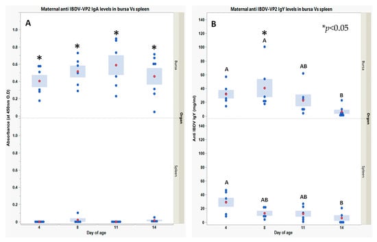Maternal anti-IBDV IgA (A) and IgY (B) within bursa vs. spleen interstitial fluids in naïve chicks for 14 days post-hatch. IgY and IgA levels were obtained using indirect (quantitative/qualitative, respectively) ELISA developed in house to recognize VP2 of IBDV (details in the Section 2). Each blue point represents an individual chick at a specific time point and organ. For each time point and organ, red points and blue bars represent the mean ± SEM of 6 individual chick measurements. For both anti-IBDV IgY and IgA, a one-way ANOVA model was used to determine the significance of differences between days’ mean values in the same organ; days headed by different letter combinations are significantly different by Tukey HSD (p < 0.05). Due to the heterogeneity of variance between organs within days, the significance of differences between organ mean values was determined via Welch-t-test (p < 0.05); differences were marked using asterisks *.