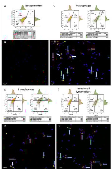 Double staining with the isotype-negative control (Figure 5, panel A) shows a single splenocyte population located almost exclusively in the fourth quarter in the FACS diagram (95.3+/−1.4%). Accordingly, only DAPI nucleus-stained cells are visible in the paired micrograph (Figure 5, panel B). As expected, no viral signal was detected in the naïve pools. Double staining of samples from vaccinated birds with the IBDV marker and the macrophages marker KUL-1 (Figure 5, panel C) revealed that 57.02 ± 3.14% of the macrophages were IBDV-positive (Q2/Q2 + Q3), while 43 ± 0.8% of the IBDV-infected cells were macrophages (Q2/Q2 + Q1). Double staining with the IBDV marker and the B lymphocyte marker BU-1 (Figure 5, panel E) revealed that 48.9 ± 6.94% of the B lymphocytes were IBDV-positive, while 62.3 ± 2.5% of the IBDV-infected cells were B lymphocytes. Interestingly, double staining of vaccinated samples with the IBDV marker and the immature B lymphocyte marker IgM (Figure 5, panel G) revealed a similar proportion of immature B cells (compared to B cells) out of total IBDV-infected cells (49.3 ± 2.9%), suggesting that ~85% of the infected B lymphocytes were immature. In all the microscope images taken from MB-1 vaccinated, double stained samples (Figure 5: panel D—macrophages, Figure 5: panel F—B lymphocytes and panel H—immature B lymphoblasts), four populations of cells are visible: double-negative cells (stained with DAPI only), IBDV-positive and cellular-marker-negative (blue and green stains), IBDV-negative and cellular-marker-positive (blue and red stains) and double-positive (IBDV and cellular marker positive with blue, red and green stains). Moreover, z-stacking demonstrated that cellular markers are limited to cell membranes, while the IBDV marker is mostly found in the cell’s cytoplasm.