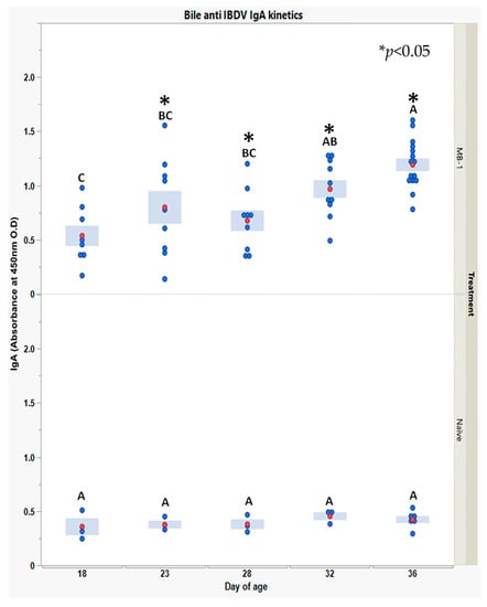 Finally, to explore whether the MB-1 vaccine also elicited mucosal immunity, we measured bile anti-IBDV IgA during 18–36 DOA.