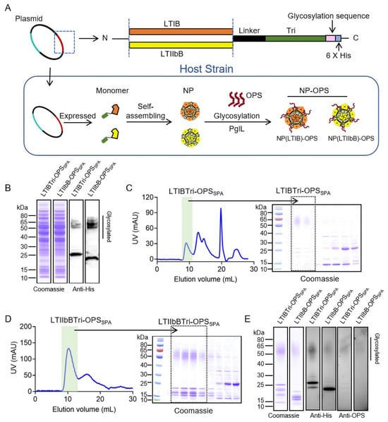 Expression and purification of glycoproteins. (A) Diagram of the nanovaccine expression process in host cells. (B) The plasmids pPglL-LTIBTri or pPglL-LTIIbBTri were transformed into the host strain 50973DWL/LT2, and then the expression of glycoproteins was detected by Coomassie blue staining and Western blotting using the HRP-labeled 6×His Tag antibody. When purified with a 24 mL column of size-exclusive chromatography (Superdex 200), LTIBTri-OPSSPA (C) and LTIIbB-OPSSPA (D) were analyzed from the collected fractions by Coomassie blue staining. (E) Analysis of the purified glycoproteins by Coomassie blue staining and Western blot using an HRP-labeled 6×His tag antibody and specific anti-OPS serum.