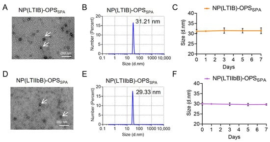 Characteristics of the purified S. paratyphi A glycoproteins. The purified glycoprotein LTIBTri-OPSSPA was analyzed using TEM (A) and DLS (B). (C) After filtering with a 0.22 µm filter, the NP(LTIB)-OPSSPA solution was incubated at 37 °C, and the stability was analyzed using DLS. (D) TEM image analysis of the LTIIbBTri-OPSSPA particle (NP(LTIIbB)-OPSSPA). (E) NP(LTIIbB)-OPSSPA was analyzed using DLS. (F) The stability of NP(LTIIbB)-OPSSPA was analyzed using DLS at different time points. The arrow in the TEM image points to the nanovaccines.