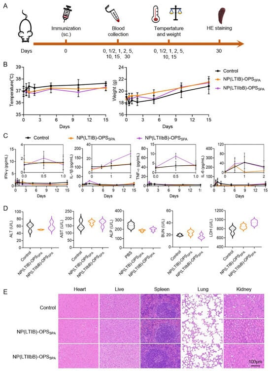 To evaluate the immune response and protective effects of the two nanoconjugate vaccines, we first assessed their safety in mice. The two vaccines, NP(LTIB)-OPSSPA and NP(LTIIbB)-OPSSPA, were administered subcutaneously at 10 times the conventional immune dose, and safety parameters were recorded at different time points. In addition, untreated mice served as the control group (Figure 3A). During a 15-day observation period, the weight and temperature changes in the vaccinated mice were consistent with those in the control group, with no significant difference (Figure 3A,B). Moreover, we collected blood from the mice’s tails at different time intervals and analyzed the concentrations of the inflammatory factors, including IFN-γ, IL-1β, TNF-α, and IL-6, in the serum. Although a slight increase in some inflammatory factors was observed 3 days post-immunization, they remained within a very safe range, suggesting that none of the four vaccines triggered systemic inflammatory responses (Figure 3C). We then tested biochemical markers, including ALT, AST, ALP, BUN, and LDH, in the serums 30 days post-injection. The results demonstrated normal ranges of each index with no significant deviations from the control group (Figure 3D). Finally, we performed histological examinations on the major organs, including the hearts, livers, spleens, lungs, and kidneys. The hematoxylin and eosin (H&E) staining results indicated the absence of any organ damage (Figure 3E).