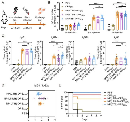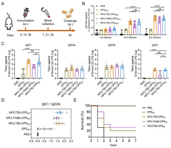 Evaluation of the antibody response and protective effect of the S. paratyphi A bioconjugate nanovaccines. (A) Schematic diagram of the immunization schedule. (B) IgG titers against S. paratyphi A CMCC 50973 LPS from the serums immunized with PBS, OPSSPA, NP(CTB)-OPSSPA, NP(LTIB)-OPSSPA, or NP(LTIIbB)-OPSSPA 7 days after each injection (n = 10). (C) IgG subtype titers (IgG1, IgG2a, IgG2b, and IgG3) against S. paratyphi A CMCC 50973 LPS were measured from serum after the third injection (day 35) (n = 10). (D) Analysis of the rate of IgG1/IgG2a from the last immunized serum. (E) Mice survival was monitored after they were challenged with the S. paratyphi A CMCC 50973 strain (1.89 × 108 CFU per mouse) 14 days after final the immunization (n = 10). Data are presented as means ± SD. Each group was compared using one-way ANOVA with Dunnett’s multiple-comparison test: **** indicates p < 0.0001, *** indicates p < 0.001, * indicates p < 0.05, and ns indicates p > 0.05.