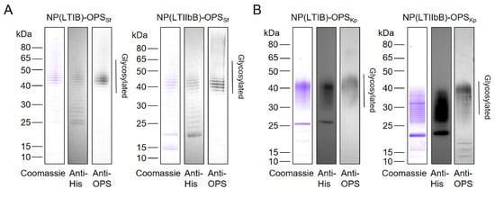 Expression and purification of the bioconjugate nanovaccines from the two hosts. (A) The plasmids pPglL-LTIBTri or pPglL-LTIIbBTri were transformed into the host strain 301DWP. After purification through affinity and size-exclusion chromatography as described before, glycoproteins, including NP(LTIB)-OPSSf and NP(LTIIbB)-OPSSf, were obtained and analyzed by Coomassie blue staining and Western blotting using an HRP-labeled 6×His tag antibody and specific anti-OPS serum for detection. (B) The plasmids, pPglL-LTIBTri or pPglL-LTIIbBTri, were transformed into the host strain, 355DW. After purification through affinity and size-exclusion chromatography, glycoproteins NP(LTIB)-OPSKp and NP(LTIIbB)-OPSKp were obtained and analyzed by Coomassie blue staining and Western blotting using an HRP-labeled 6×His tag antibody and specific anti-OPS serum for detection.