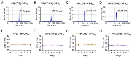 Analyses of the purified glycoproteins. (A–D) The four purified glycoproteins, namely, NP(LTIB)-OPSSf, NP(LTIIbB)-OPSSf, NP(LTIB)-OPSKp, and NP(LTIIbB)-OPSKp, were analyzed using DLS. (E–H) The stability of the four nanovaccines was analyzed. After filtering with a 0.22 µm filter, the NP(LTIB)-OPSSf, NP(LTIIbB)-OPSSf, NP(LTIB)-OPSKp, and NP(LTIIbB)-OPSKp solutions were incubated at 37 °C, and the sizes were detected using DLS at different time points.