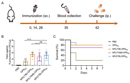 Evaluation of the antibody response and protective effect of the K. pneumoniae bioconjugate nanovaccines. (A) Schematic diagram of the immunization schedule. (B) IgG titers against the K. pneumoniae strain 355 LPS in the serum. BALB/c mice were immunized with PBS, OPSKp, NP(CTB)-OPSKp, NP(LTIB)-OPSKp, and NP(LTIIbB)-OPSKp, and the serums were sampled 7 days after the third injection (day 35) (n = 10). (C) At 14 days after the final immunization, each mouse was challenged with 3.57 × 107 CFU of the K. pneumoniae strain 355, and the survival of the mice was monitored (n = 10). Data are presented as means ± SD. Each group was compared using one-way ANOVA with Dunnett’s multiple-comparison test: **** indicates p < 0.0001 and ns indicates p > 0.05.