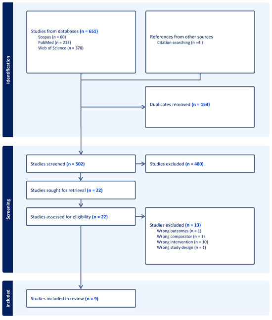 A total of 651 articles were identified in our search, and after removing 153 duplicates, 498 were screened. According to our eligibility criteria, four studies were added after searching the citations of other papers. Out of 502 articles, 480 were excluded after analysis of the title and abstract. Then, 22 full-text articles were assessed for eligibility, and 13 were excluded because 10 evaluated an irrelevant intervention, 1 included an irrelevant population control (comparator), 1 did not use a study design that was considered eligible (review), and 1 reported an outcome not relevant to our research question (Figure 1).