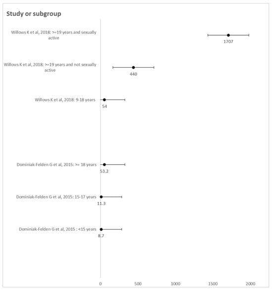 The incidence rate of GWs in women vaccinated reported by six cohorts varied from 0.0 to 1650 per 100,000 person-years. These values were reported in the same study []. The highest incidence rates of GWs were found in women vaccinated at 17–18 years old with less than two doses (>1000 per 100,000 person-years) and in 19-year-old girls with one dose (1650 per 100,000 person-years); such a rate of incidence was similar among unvaccinated girls/women []. Moreover, among women vaccinated at 19 years or older, whether sexually active or not, the incidence of GWs was found to be similar to that of unvaccinated women, regardless of the number of doses administrated, in the retrospective study conducted in Manitoba, Canada []. Regarding the age of vaccination, it ranged from 9–11 years old to over 19 years old. This incidence was 0.0 per 100,000 person-years in Danish girls vaccinated at the age of 9–11 years old and increased to 87.5 per 100,000 person-years at a vaccination age of 16–17 years old []. On the other hand, Baandrup et al. reported an incidence of less than 250 per 100,000 person-years in all dose groups among Danish girls vaccinated under 16 years old []. Concerning GWs in young vaccinated women stratified by age of vaccination, an incidence of 8.7 in girls fully vaccinated with the first dose at under 15 years old and an incidence of 11.3 if vaccination occurred at 15–17 years old were reported in the Belgian study []. On the other hand, an incidence of 54 per 100,000 person-years was also found in girls vaccinated at 9–18 years old in the study conducted in Manitoba, Canada [] (Figure 2). Data reported by Blomberg et al. [] and Baandrup et al. [] were not presented due to the absence of confidence intervals, although the results were also stratified by age of vaccination.