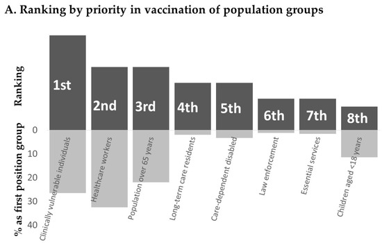 Clinically vulnerable individuals, HCWs and population over 65 years were considered the first three groups to be involved in getting a vaccination, being indicated as the first position group by 26.5%, 32.5% and 21.9% of respondents, respectively (Figure 2A). Remarkably, long-term care residents, ranked 4th by score, were indicated as the first position group only by 1.9% of respondents.