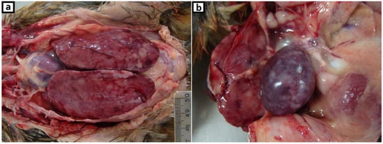 Gross, hen, 12-weeks-old. Multifocal to coalescing white foci associated with (a) marked enlarged liver, (b) marked enlarged spleen.
