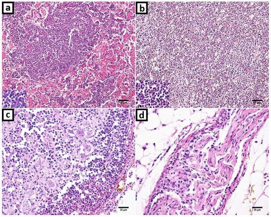 Marked uniform small to medium size neoplastic lymphocytes were infiltrating and replacing multifocal to diffuse the liver and spleen parenchyma (Figure 2a,b). There were multifocal neoplastic lymphoid cells in the kidney and lung. Trachea, proventriculus, gizzard, and small intestine lamina propria showed increased thickness by uniform neoplastic lymphocytes infiltration. Peripheral nerves and ganglion were moderate to marked infiltrated by uniform neoplastic lymphocytes, as showed in Figure 2c,d, respectively. There were few heterophils and plasma cells among neoplastic lymphocytes in all organs examined. Thymic atrophy also was observed in part and there were lymphocytes arranged in focal nodules.