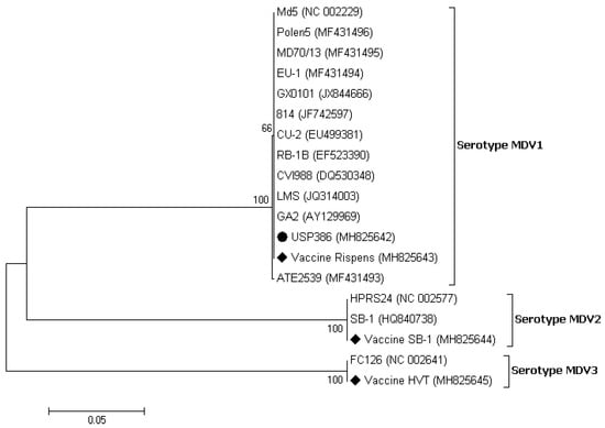 Phylogenetic analysis of the nucleotide sequences of the MDV strains based on the partial gB gene. The strain names and GenBank accession numbers are shown. The black circle represents the field MDV strain used in this study. The black rhombus represents the MDV vaccinal control strains. The phylogenetic tree was constructed in MEGA v7.0 using the Neighbor-Joining method with 1000 bootstrap replicates. The evolutionary distances were computed using the Kimura 2-parameter model (K2 + G + I), and the scale bar represents the number of base substitutions per site.