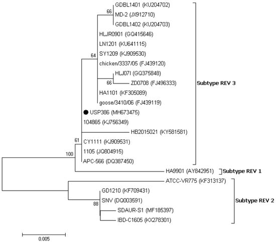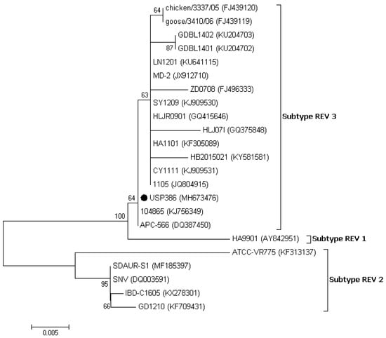 Brazilian backyard flocks are usually not vaccinated against most of the avian viruses and even isolated cases of disease are not properly communicated. In South America, antibodies against REV have been detected alone in Peru by ELISA test [] or in coinfection with MDV in Argentina by Agar gel precipitation (AGP) tests and fluorescent antibodies assays []. However, these reports did not provide molecular characterization of these viruses.