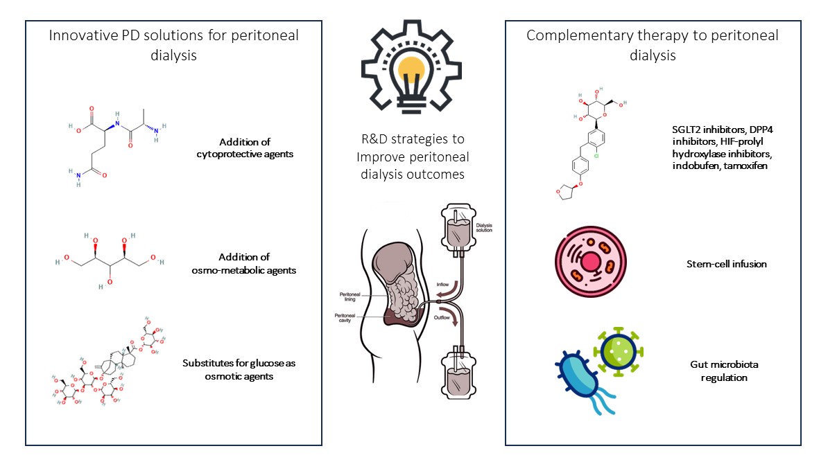 Peritoneal dialysis (PD) is a home-based efficacious modality for the replacement of renal function in end-stage kidney failure patients, but it is still under-prescribed. A major limitation is the durability of the dialytic technique. Continuous exposure of the peritoneum to bioincompatible conventional glucose-based solutions is thought to be the main cause of the long-term morpho-functional peritoneal changes that eventually result in ultrafiltration failure. Poor PD solution biocompatibility is primarily related to the high glucose content, which is not only detrimental to the peritoneal membrane but has many potential metabolic side effects. To improve the clinical outcome and prolong the survival of the treatment, PD-related bioincompatibility urgently needs to be overcome. However, combining dialytic and osmotic efficacy with a satisfactory biocompatible profile is proving to be quite difficult. New approaches targeting the composition of the PD solution include the replacement of glucose with other osmotic agents, and the addition of cytoprotective or osmo-metabolic compounds. Other strategies include the infusion of mesenchymal cells or the administration of orally active agents. In the present article, we review the current evidence on efforts to improve the biocompatible and functional performance of PD, focusing on studies performed in vivo (animal models of PD, human subjects on PD). Full article