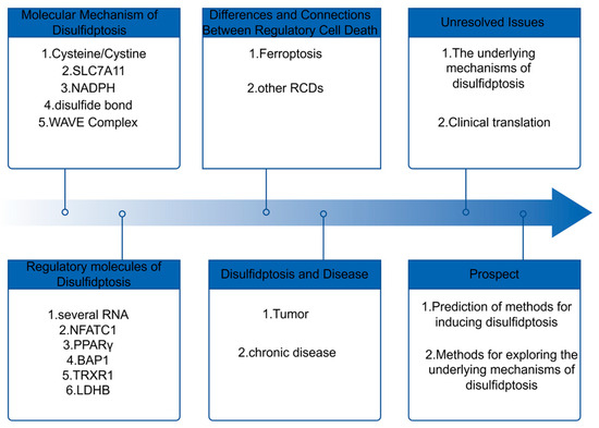 Disulfidptosis is a recently identified form of regulatory cell death (RCD), Which has emerged as a research hotspot due to its distinctive feature of accumulating protein disulfide bonds, setting it apart from other RCD mechanisms. This discovery may offer new therapeutic strategies for cancer and various chronic diseases. This review aims to summarize the molecular mechanisms, inhibitors, regulatory networks, distinctions and connections between disulfidptosis and other regulatory death pathways, and the application of disulfidptosis in tumors and other chronic diseases. It also identifies unresolved issues and provides an outlook on future prospects. Full article
