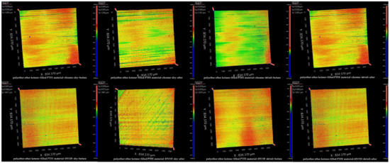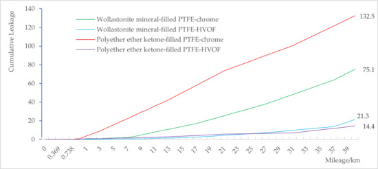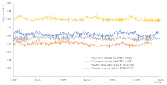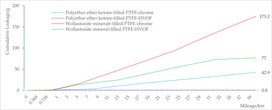 This study first assessed the friction and wear properties of two polytetrafluoroethylene materials sliding against electroplated chrome and high-velocity oxy-fuel-sprayed WC-10Co-4Cr coatings. Subsequently, the sealing performance of three different structure seals made from these two polytetrafluoroethylene materials was investigated on both electroplated chrome and high-velocity oxy-fuel-sprayed WC-10Co-4Cr coatings. The study results indicate the following: in terms of changes in the counter-face surface roughness, both the electroplated chrome and high-velocity oxy-fuel-sprayed WC-10Co-4Cr surfaces exhibited an increase in surface roughness after sliding, demonstrating the phenomenon of “soft material wearing hard material.” Moreover, the changes in surface roughness were greater after sliding against wollastonite mineral-filled polytetrafluoroethylene than against polyether ether ketone-filled polytetrafluoroethylene, indicating that wollastonite mineral-filled polytetrafluoroethylene was more likely to cause damage to the metal surface. Regarding the friction coefficient and wear amount, under dry friction conditions, both materials exhibited higher friction coefficients but lower wear rates on high-velocity oxy-fuel-sprayed WC-10Co-4Cr surfaces, while showing lower friction coefficients but higher wear rates on electroplated chrome surfaces. This behavior was related to the ease of transfer film formation and the stability of the transfer films formed by polytetrafluoroethylene materials on the two surfaces. In terms of the products’ sealing performance, test results showed that, for composite seals with polytetrafluoroethylene as the counter-face, sealing performance was better on high-velocity oxy-fuel-sprayed WC-10Co-4Cr surfaces than on electroplated chrome surfaces. For seals with rubber as the counter-face, there was little difference in sealing performance between high-velocity oxy-fuel-sprayed WC-10Co-4Cr and electroplated chrome surfaces. Full article