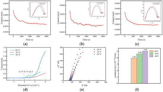 The stability of the electrolyte is very important for the development of high-performance all-solid-state lithium batteries. To improve the stability of electrolyte performance, it is essential to first understand the causes of its deterioration. Physically speaking, the degradation of electrolyte performance is mainly due to interface degradation. PAN-PVDF-HFP-LiClO4-Li6.4La3Zr1.4Ta0.6O12 (LLZTO) gel polymer electrolyte was prepared by the UV curing method and assembled into a solid-state battery. The electrochemical properties of solid-state batteries were tested at −20 °C, 30 °C, and 60 °C. The test results show that the gel polymer electrolyte exhibits good electrochemical performance in this temperature range. (The ionic conductivities of the gel polymer electrolyte at −20 °C and 60 °C were 3.95 × 10−4 S·cm−1 and 5.04 × 10−4 S·cm−1, respectively.) At a current density of 0.2 C, the battery exhibited high initial specific discharge capacities of 122 mAh g−1 and 151.6 mAh g−1 at −20 °C and 60 °C. The gel polymer electrolyte before and after working at different temperatures was characterized, and the ion transport was analyzed to explore the physical reasons for the degradation of the gel polymer electrolyte membrane interface. Therefore, this work provides a certain theoretical basis for improving the stability of solid-state lithium-ion batteries. Full article