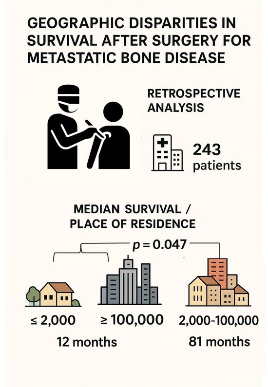 Background/Objectives: Metastatic bone disease (MBD) poses an increasing challenge in orthopaedic oncology due to prolonged survival. While clinical prognostic factors are well established, the role of socio-economic determinants remains unclear, particularly within universal healthcare systems. Methods: We retrospectively analysed 243 patients who underwent surgery for MBD (excluding spine) between 2005 and 2024 at a German sarcoma centre. Socio-economic indicators were derived from national databases and linked to patients’ residential districts. Survival was analysed using Kaplan–Meier estimates and Cox regression, adjusting for clinical confounders. Results: Median postoperative survival was 22 months. Several socio-economic indicators—income, education, and employment—were associated with survival in univariate analysis. In multivariate models, only residential area size remained independently significant (p = 0.047). Patients from villages (<2000 inhabitants) and large cities (>100,000) had poorer survival than those from small or medium-sized towns. This effect persisted after adjustment for tumour type, pathological fractures, and year of surgery. Conclusions: Within a universal healthcare system, residential area size was associated with survival after surgery for MBD, suggesting that regional disparities may persist despite equal formal access to care. Further studies integrating individual-level socioeconomic data are needed to identify mechanisms and guide interventions to reduce geographic inequalities. Full article