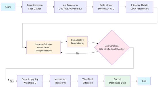 In marine seismic exploration, ghost waves distort reflection waveforms and narrow the frequency band of seismic records. Traditional deghosting methods are susceptible to practical limitations from sea surface fluctuations and velocity variations. This paper proposes a τ-p domain deghosting method based on the Hybrid Least Squares Residual (HyBR LSMR) algorithm. We first establish a linear forward model in the τ-p domain that describes the relationship between the total wavefield and upgoing wavefield, transforming deghosting into a linear inverse problem. The method then employs the hybrid LSMR algorithm with Tikhonov regularization to address the inherent ill-posedness. A key innovation is the integration of the Generalized Cross Validation (GCV) criterion to adaptively determine regularization parameters and iteration stopping points, effectively avoiding the semi-convergence phenomenon and enhancing solution stability. Applications to both synthetic and field data demonstrate that the proposed method effectively suppresses ghost waves under various acquisition conditions, significantly improves the signal-to-noise ratio and resolution, broadens the effective frequency band, and maintains good computational efficiency, providing a reliable solution for high-precision seismic data processing in complex marine environments. Full article