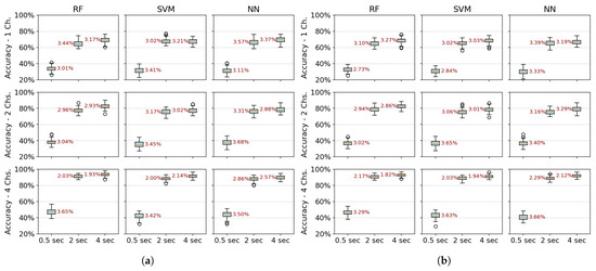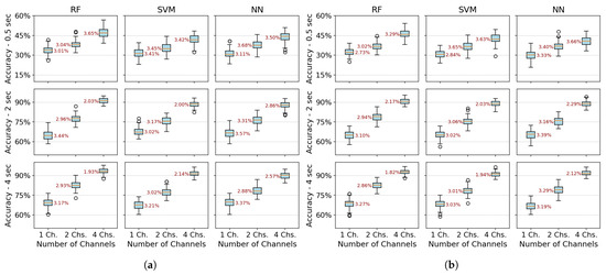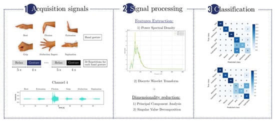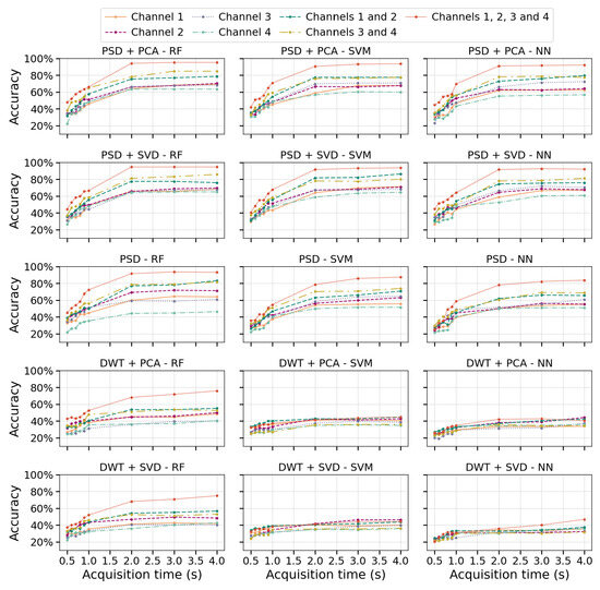 Electromyography-based assistive and rehabilitation devices have shown potential for restoring mobility, especially for post-stroke patients. However, the variability of biological signals and the processing delays caused by signal acquisition and feature extraction influence myoelectric control systems’ real-time functionality and robustness. This study evaluates the classification performance of electromyographic (EMG) signals for six distinct hand gestures in healthy individuals and post-stroke patients. Different feature extraction methods and machine learning algorithms are employed to analyze the impact of acquisition time (0.5–4 s) and the number of channels (1–4) on model accuracy, robustness, and generalization. The best results are obtained using power spectral density and dimensionality reduction, reaching a classification accuracy of 94.79% with a 2 s signal and 95.31% for 4 s. Acquisition time has a greater effect on accuracy than the number of channels used with accuracy stabilizing at 2 s. We test for generalization using post-stroke patient data, evaluating two scenarios: intra-patient validation with 90% accuracy and cross-patient validation with 35–40% accuracy. This study contributes to developing effective real-time myoelectric control systems for neurorehabilitation. Full article