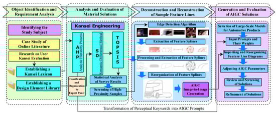 Symmetry in vehicle body morphology is a crucial factor for achieving visual sensory balance in users, and it also serves as an important method for enhancing the efficiency of vehicle body research and development. This study proposes an AHP-SD-TOPSIS-AIGC integrated morphological design method to address multi-factorial design complexities in new energy commercial vehicle body styling under emotion-driven frameworks. Through literature retrieval and survey analysis, a Kansei evaluation system was constructed, with hierarchical design indicators established via Analytic Hierarchy Process (AHP) and weights determined through consistency matrices. Technique for Order Preference by Similarity to Ideal Solution (TOPSIS) identified optimal style forms exhibiting high emotional intention coupling, while edge detection algorithms extracted symmetrical spline features for body contour modeling. Artificial Intelligence Generated Content (AIGC) tools subsequently generated innovative solutions, validated through truck design applications to confirm method rationality and effectiveness. The results of the study show that the styling elements are accurately matched to user preferences and can identify target improvement points, and that the method can effectively achieve the output of the proposal for the design of commercial vehicle body morphology and is also applicable to passenger car-type vehicles to achieve the adaptation of multi-intentional emotional design. Full article