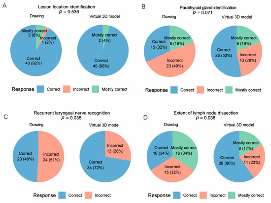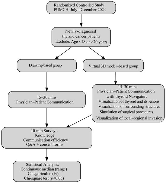 Background: Effective preoperative patient counseling is essential to shared decision-making. In thyroid surgery, patient communication can be complicated by the complex anatomy and variable surgical approaches, which may not be fully conveyed through conventional verbal explanations or schematic drawings. Virtual three-dimensional (3D) thyroid models may provide an intuitive tool to enhance patient comprehension. Methods: We conducted a randomized controlled trial at Peking Union Medical College Hospital with 94 newly-diagnosed thyroid cancer patients scheduled for thyroidectomy. Participants were assigned to either the control group (n = 47), which received preoperative drawing-based counseling, or the intervention group (n = 47), which utilized a virtual 3D model for communication. The Thyroid Navigator app, developed by Kuma Hospital, was used to provide dynamic 3D representation of the thyroid gland, surrounding structures, and potential surgical procedures. After standardized preoperative consultations, patients were surveyed to assess their understanding in pertinent anatomy and postoperative complications. Results: Patients in the 3D model group demonstrated similar correct response rates in lesion localization (p = 0.536) or parathyroid gland recognition (p = 0.071), but significantly higher accuracy in identifying the recurrent laryngeal nerve and the extent of lymph node dissection compared with the control group (p < 0.05). Moreover, comprehension of the causes of major postoperative complications—including hoarseness (recurrent laryngeal nerve injury, p = 0.004), hypocalcemia (parathyroid gland impairment, p = 0.015), and bleeding (inadequate hemostasis, p = 0.008)—was significantly improved in the 3D model group. Conclusions: Use of a virtual 3D thyroid model significantly improves patient comprehension of thyroid anatomy, surgical procedures, and potential complications, thereby enhancing clinician–patient communication. Virtual 3D models represent a practical and cost-effective supplement to conventional counseling in thyroid surgery, offering clear benefits in patient education and shared decision-making. Full article