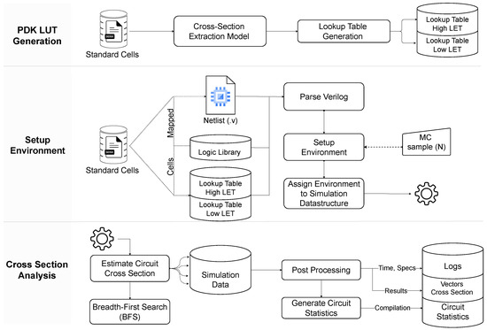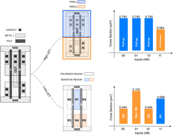 Semiconductor technologies are susceptible to radiation effects. The particle incidence in susceptible areas of an integrated circuit (IC) can generate physical interactions capable of producing errors. This paper predicts the IC cross sections for Single Event Effects. The cross section is a metric that provides an IC’s susceptibility to radiation. It deals with particle source interaction and physical design volumes. This work evaluates the IC cross section, exploring the physical design characteristics of susceptible regions in logic gates. It explores particles with low LET, identifying the charge collection areas. Also, the heavy ions are used to evaluate the critical cross section range. Distinct benchmark circuits were simulated to characterize sensitivity trends. The influence of circuit input conditions along with cells’ susceptibility reveals significant findings. The results indicate a difference up to ten times between low- and high-energy particles. Consequently, predicting the IC cross section at an early stage of the design flow is essential, especially for electronics devices used in radiation environments. Full article
