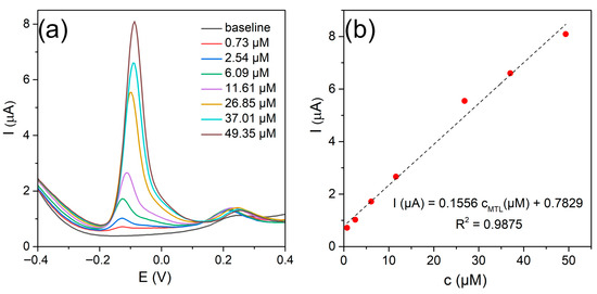 This work used activated carbon material obtained by chemical activation of abundantly available agricultural sunflower waste residues to remove metol (4-(methylamino) phenol sulfate, MTL) from aqueous solutions. The adsorbent structure was characterized using SEM-EDS and FT-IR spectroscopy. A modified screen-printed carbon electrode (SPCE) with gold nanoparticles synthesized using the Laser Ablation Synthesis in Solution (LASIS) method was used to detect MTL. The successful LASIS formation of gold nanoparticles was confirmed by the specific dark burgundy–red color. TEM measurements showed uniform pseudo-spherical particles with an average diameter of 7.9 ± 0.2 nm. The modified electrode showed improved electrochemical activity, which was confirmed by comparing it with an unmodified electrode using cyclic voltammetry and electrochemical impedance spectroscopy. The modified electrode was subsequently used to optimize the MTL detection conditions. UV–Vis spectroscopy was used to optimize the adsorption conditions, with the optimal values for pH and contact time found to be 8 and 120 min, respectively. The electrochemical detection of MTL was performed using differential pulse voltammetry, and the linear calibration range was established for concentrations ranging from 0.73–49.35 µM. The obtained limits of detection (LOD) and quantification (LOQ) were 0.06 µM and 0.2 µM, respectively. The efficiency of MTL removal was 100% after a contact time of 1 min and remained at 100% after 120 min. Full article