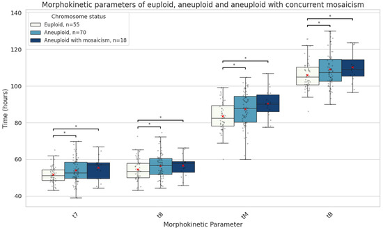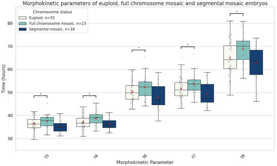 Objectives: This study aimed to determine whether chromosomal mosaicism in blastocysts is associated with a distinct morphokinetic signature. Methods: Preimplantation genetic testing for aneuploidy (PGT-A) was performed on 182 human embryos via trophectoderm biopsy on day 5 and analyzed by next-generation sequencing. Embryos were classified as euploid (n = 55), mosaic (n = 39: 21 low-grade, 18 high-grade), or aneuploid (n = 88), of which 18 with concurrent mosaicism. Prior to biopsy, embryos were cultured in a time-lapse system (EmbryoScope), and 12 morphokinetic parameters were assessed, including pronuclei fading (tPNf), cleavage times (t2–t9), morula formation (tM), blastulation start (tSB), and full blastocyst formation (tB). These parameters were compared according to ploidy status. Results: Patients with euploid and mosaic embryos were comparable in terms of maternal age, ART indication and embryo quality (p > 0.05). In contrast, aneuploid embryos were obtained from older patients and had lower morphological grades. Mosaic embryos showed delayed tPNf (24.8 ± 6.5 vs. 22.8 ± 2.3 h, p = 0.03) and t2 (27.6 ± 6.6 vs. 25.4 ± 2.5 h, p = 0.02) compared to euploid embryos, mainly attributable to low-grade mosaic embryos. Whole-chromosome mosaicism, but not segmental mosaicism, was associated with delayed embryo development at several intermediate cleavage time points (t3, t4, t6, t7 and t9). Aneuploid embryos showed significant delays at later stages versus euploid embryos, particularly aneuploid embryos with mosaicism at t7 (56.6 ± 8.3 vs. 52 ± 5.6 h, p = 0.02), t8 (59.1 ± 9.6 vs. 54.8 ± 6.7 h, p = 0.04), tM (90.3 ± 7.7 vs. 83.6 ± 8.2 h, p = 0.006) and tB (113.0 ± 11.6 vs. 106.6 ± 8.9 h, p = 0.03). Conclusions: Mosaic embryos exhibit delays in early development (tPNf, t2) but reach later morphokinetic milestones at rates similar to euploid embryos. In contrast, aneuploid embryos, especially those with mosaicism, exhibit marked developmental delays at later stages (t7, t8, tM, tB). Full article