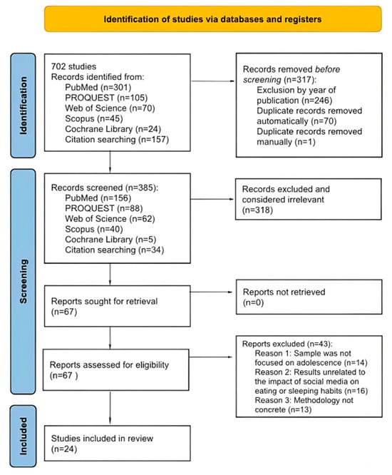 Background/Objectives: Social media has become a key activity in adolescents’ lives, with potential implications for their health and well-being. Because of this, the objective was to examine the influence of social media on the eating behavior and sleep quality of adolescents aged 13 to 18 years. Methods: The PubMed, Scopus, Proquest, Web of Science, and Cochrane Library databases were reviewed following the PRISMA protocol. The inclusion criteria for the studies were as follows: a sample of adolescents aged 13 to 18 years without a baseline clinical diagnosis and research objectives related to social media and its influence on eating behavior or sleep quality. A total of 24 articles were included at the end of the search. Due to heterogeneity in measurement formats, a single pooled analysis was not feasible. Instead, two partial random-effects meta-analyses of continuous outcomes were performed (sleep and eating behaviours). Results: Qualitative synthesis revealed consistent associations between problematic social media use, poor sleep quality, and disordered eating. The meta-analyses showed a small-to-moderate and statistically significant association on sleep quality (r = 0.36) while the pooled estimate for eating behaviours was imprecise and not significant (r = 0.35), reflecting the very limited number of eligible studies. Conclusions: Excessive social media use is associated with poorer sleep and eating outcomes among adolescents. These findings highlight the need for educational and preventive strategies promoting healthy digital habits and psychological well-being. This systematic review elucidates the implications of social media use for health promotion at this development stage. Full article