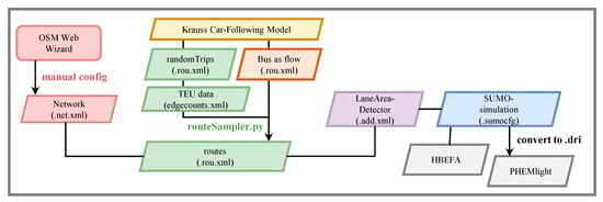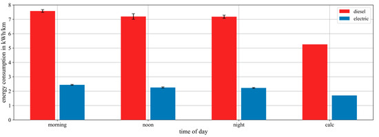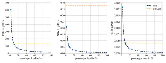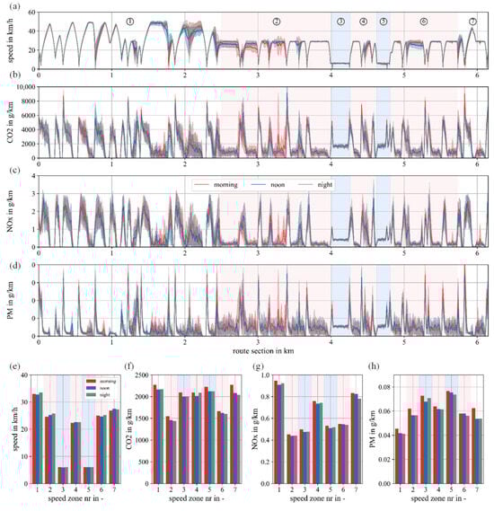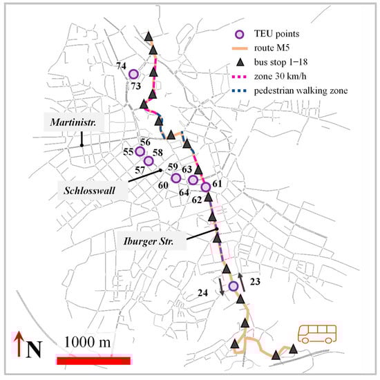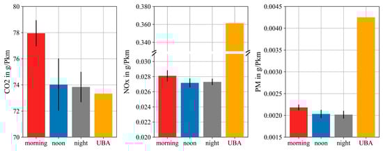 This study quantifies energy consumption and tank-to-wheel (TTW) emissions of urban buses under varying traffic conditions and passenger loads in Osnabrück, Germany, to support emission-aware route assessment in sustainable mobility applications. Exemplary bus trajectories were modeled on a representative 6.17 km route of line M5 (18 m articulated bus; diesel and battery-electric) within a 22.31 km2 traffic net using the Simulation of Urban MObility (SUMO) software, and were calibrated with traffic sensor data. To assess the influence of trajectories in different traffic situations, three different 90 min scenarios were compared (morning peak, noon, night). Trajectory-based energy consumption and greenhouse gas emissions were compared by using the SUMO-implemented emission models HBEFA and PHEMlight, as well as data from the literature. Both diesel and electric buses showed variations in energy consumption depending on the traffic conditions, with generally lower energy consumption for electric propulsion. Temporal differences in the TTW emissions of the diesel bus were modest, with slightly higher morning values, while spatial analysis showed PM peaks in pedestrian zones, NOx peaks during acceleration phases, and CO2 increases after stops and in low-speed areas. The results provide spatially resolved TTW factors for integration into routing applications, excluding upstream and non-exhaust processes in line with the defined system boundary. Full article