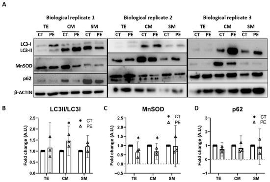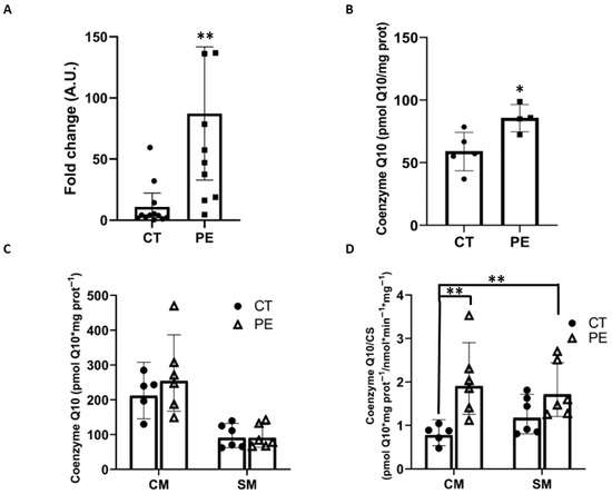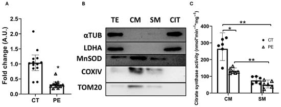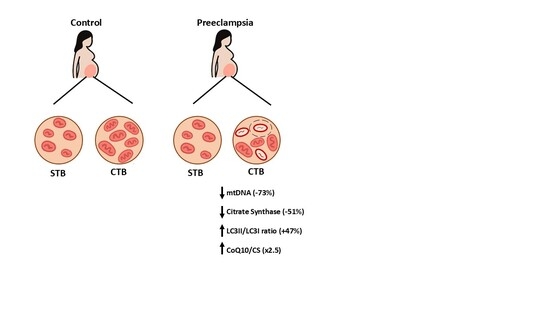 Preeclampsia is a serious pregnancy disorder of unknown etiology. One of its cellular hallmarks is increased mitochondrial dysfunction in placental tissue. Further investigation into this aspect may help elucidate the molecular basis of preeclampsia. A total of 24 pregnant women who delivered by cesarean section participated in the study: n = 13 controls and n = 11 diagnosed with preeclampsia. Maternal blood samples were collected to assess the biochemical profile, and demographic and clinical data were recorded. Placental trophoblast samples were processed to isolate mitochondria and perform molecular biology assays. Women with preeclampsia exhibited the characteristic clinical features of the disease, along with biochemical alterations consistent with an inflammatory process. A significant decrease (73%) in mitochondrial DNA (mtDNA) copy number in trophoblastic tissue and a reduction in citrate synthase (CS) activity (−51%) in cytotrophoblast mitochondria-enriched fractions were observed in preeclampsia, indicating mitochondrial dysfunction accompanied by a loss of functional mitochondrial mass. In addition, we detected a marked decrease in MnSOD levels (−32%), together with an increase in the LC3II/LC3I ratio (47%) in cytotrophoblast mitochondria-enriched fractions, supporting the presence of mitochondrial alterations and suggesting the possible activation of mitophagy specifically in this cell type. Moreover, coenzyme Q10 (CoQ10) levels were elevated by 31% in trophoblastic villi. A pronounced 2.5-fold increase in CoQ10 normalized to CS activity (CoQ10/CS) was detected specifically in cytotrophoblasts from preeclamptic placentas. Importantly, we did not observe these alterations in the syncytiotrophoblast. In conclusion, preeclampsia is associated with mitochondrial dysfunction and increased CoQ10 levels normalized to CS activity, specifically in cytotrophoblast mitochondria, with findings being consistent with a possible involvement of mitophagy in this cell type. These findings suggest that cytotrophoblast mitochondrial metabolism may be more affected in preeclampsia compared with syncytiotrophoblasts, and that CoQ10 accumulation together with the possible activation of mitophagy may represent cellular defense mechanisms. Due to the limitations of the study, it should be considered exploratory and hypothesis-generating, and its results should be regarded as preliminary. Full article