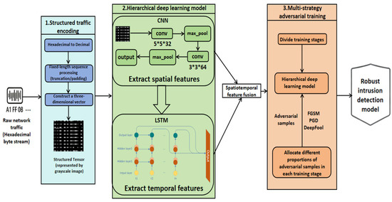 Network intrusion detection is a key technology for ensuring cybersecurity. However, current methods face two major challenges: reliance on manual feature engineering, which leads to the loss of discriminative information, and the vulnerability of deep learning models to adversarial sample attacks. To address these issues, this paper proposes STS-AT, a novel network intrusion detection method that integrates structured tensors with adversarial training. The method consists of three core components: first, structured tensor encoding, which fully converts raw hexadecimal traffic into a numerical representation; second, a hierarchical deep learning model that combines CNN and LSTM networks to simultaneously learn spatial and temporal features of the traffic; third, a multi-strategy adversarial training method that enhances model robustness by adaptively adjusting the mix of adversarial samples in different training phases. Experiments on the CICIDS2017 dataset show that the proposed method achieves an accuracy of 99.6% in normal traffic classification, significantly outperforming classical machine learning baselines such as Random Forest (93.1%) and Support Vector Machine (84.7%). Crucially, under various adversarial attacks (FGSM, PGD, and DeepFool), the accuracy of an undefended model drops to as low as 24.4%, whereas after multi-strategy adversarial training, the defense accuracy rises above 96.8%. Meanwhile, the total training time is reduced by approximately 67.6%. These results verify that structured tensor encoding effectively preserves original traffic information, the hierarchical model achieves comprehensive feature learning, and multi-strategy adversarial training significantly improves training efficiency while ensuring robust defense effectiveness. Full article