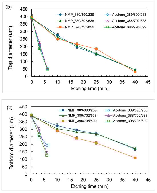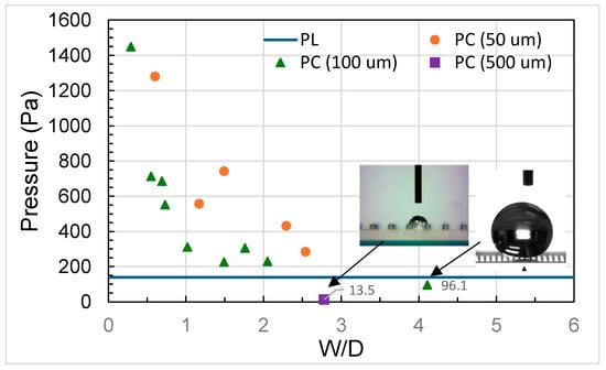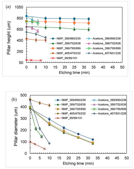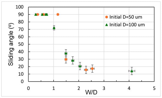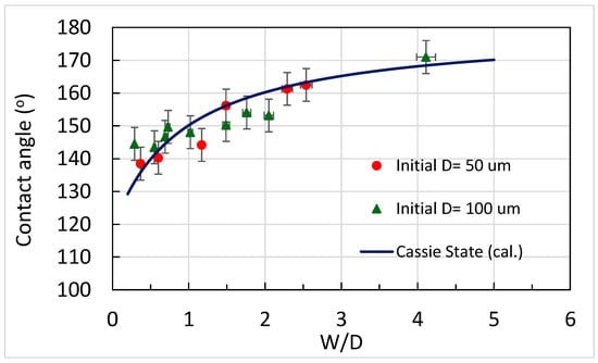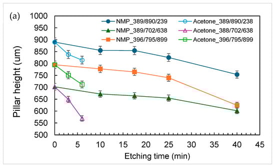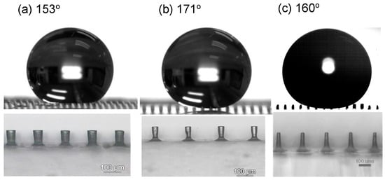 Superhydrophobic surfaces have gained considerable attention due to their ability to repel water and reduce surface adhesion, and they are now widely applied for self-cleaning, anti-fouling, anti-icing, and corrosion resistance purposes. In this study, either a computer numerical control (CNC) machine or photolithographic techniques were employed to fabricate molds with microwells, followed by soft lithography to obtain a polydimethylsiloxane (PDMS) micropillar array. An etching process was then carried out. It was found that, as etching time increased, the diameters of micropillars decreased, leading to a decrease in the solid fraction of the composite surface and increases in contact angles. When the ratios of spacing to diameter (W/D) and of height to diameter (H/D) both exceeded 1.5, the contact angle was found to exceed 150° and the original PDMS micropillar surface with a contact angle of around 135° became superhydrophobic. A drastic decrease in sliding angle was also observed at this threshold. Changes in contact angles with different W/D values were in good agreement with values calculated using the Cassie–Baxter equation, and the droplet state was verified by a pressure balance model. Meanwhile, the PDMS etching rate when using acetone as the solvent was approximately 6–8 times faster than that when using 1-Methyl-2-pyrrolidone (NMP), a result which is comparable to data in the literature. Full article
