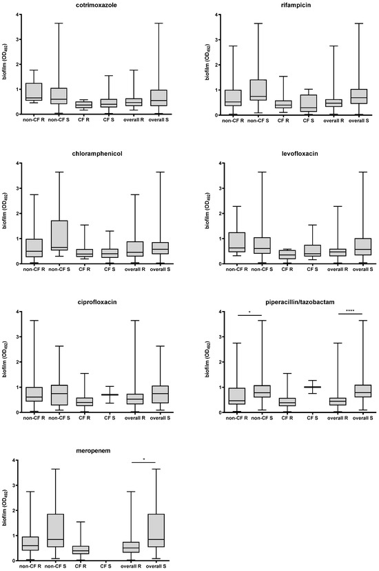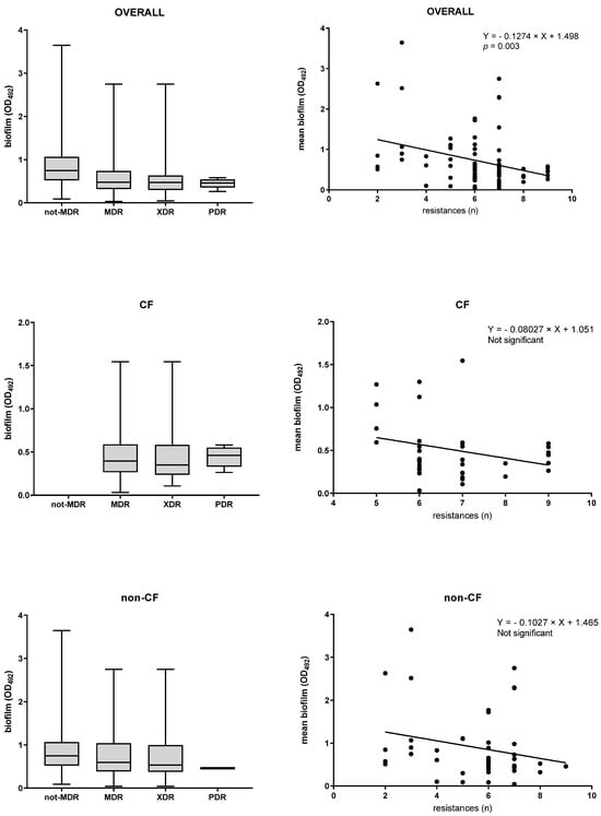 Background/Objectives: Stenotrophomonas maltophilia is an opportunistic pathogen causing severe infections, particularly in patients with cystic fibrosis (CF). Its intrinsic multidrug resistance and biofilm-forming capacity complicate treatment. Although biofilms are generally associated with antimicrobial tolerance, the relationship between biofilm formation and planktonic antibiotic resistance in S. maltophilia remains poorly understood. This study investigated the association between antibiotic resistance profiles and biofilm production in clinical isolates from CF and non-CF patients. Methods: A total of 86 clinical isolates (40 from CF airways and 46 from non-CF patients) were analyzed. Susceptibility to seven antibiotics was assessed by disk diffusion, and multidrug resistance profiles were defined using standard criteria. Biofilm formation was quantified after 24 h using a crystal violet microtiter plate assay and categorized by using a semiquantitative scale. Results: High resistance rates were observed, particularly to meropenem (87.2%), ciprofloxacin (80.2%), and rifampicin (72.1%). CF isolates exhibited significantly higher resistance to piperacillin/tazobactam and a greater prevalence of multidrug resistance. Biofilm formation was detected in 94.2% of isolates, with strong or powerful producers predominating. However, CF isolates formed significantly less biofilm than non-CF isolates. Notably, resistance to piperacillin/tazobactam and meropenem was associated with reduced biofilm biomass and a lower proportion of high biofilm producers. Across all isolates, an inverse correlation was observed between the number of antibiotic resistances and biofilm biomass. These trends persisted after stratification by clinical origin, although some comparisons did not reach statistical significance. Conclusions: This study reveals an unexpected inverse relationship between planktonic antibiotic resistance and biofilm-forming capacity in S. maltophilia. Enhanced biofilm production may represent an alternative persistence strategy in more antibiotic-susceptible strains, with important implications for infection management and therapeutic failure. Full article