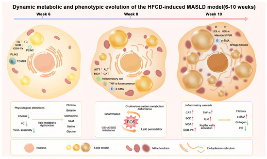Metabolic dysfunction-associated steatotic liver disease (MASLD) is strongly linked to systemic metabolic disturbances and features a lipid-driven cascade that promotes hepatic inflammation and fibrosis. Choline insufficiency contributes to disease advancement by altering phospholipid turnover and redox homeostasis; however, its spatial and temporal regulatory roles throughout MASLD progression remain insufficiently defined. A 10-week high-fat, choline-deficient (HFCD) mouse model was established, and liver pathology was evaluated at weeks 6, 8, and 10. Time-resolved assessments combined untargeted metabolomics, magnetic resonance imaging–proton density fat fraction (MRI-PDFF), serum biochemistry, histological staining, immunofluorescence, and transmission electron microscopy to characterize dynamic alterations in lipid metabolism, redox status, inflammation, and fibrogenesis. The HFCD diet produced a clear temporal sequence of liver injury. Steatosis, phosphatidylcholine depletion, and early antioxidant loss appeared by week 6. By week 8, mitochondrial structural damage and pronounced cytokine elevation were evident. At week 10, collagen deposition and α-SMA activation signaled fibrotic progression. Metabolomics indicated significant disruptions in pathways related to ATP-binding cassette (ABC) transporters, one-carbon metabolism, and the tricarboxylic acid (TCA) cycle. Using integrated analytical strategies, this study suggests that choline deficiency may be associated with a time-dependent pathological cascade in MASLD, beginning with phospholipid destabilization and extending to altered mitochondria–endoplasmic reticulum crosstalk at mitochondria-associated membranes, alongside amplified oxidative–inflammatory responses, which collectively may contribute to progressive fibrogenesis as the disease advances. Full article