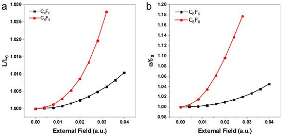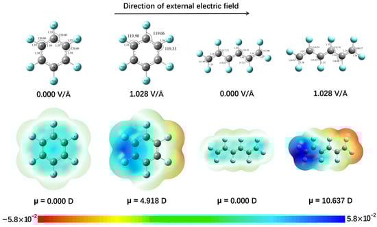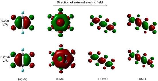 Ultra-high voltage (UHV) power transmission has become a prerequisite for the development of clean energy. However, arcs generated by UHV circuit breakers can easily lead to safety incidents, and developing arc-extinguishing gases with low global warming potential (GWP) presents certain challenges. It is a fact that fluorolefins, as a class of fluorinated compounds with low GWP, show high application potential in replacing traditional arc-extinguishing agents. In this study, all six conjugated perfluorinated compounds, including C6F6 and C6F8, were calculated within the density functional theory (DFT) framework at the B3LYP/6-311+G(d,p) level. The dipole moments, HOMO/LUMO energy gaps, and the inherent aromaticity of annular molecules under external electric fields of these fluorinated molecules are investigated accordingly. By analyzing these results, it is found that the influence of the conjugated structure on the stability of arc-extinguishing gases under high-voltage conditions was partially elucidated, providing useful insights for the subsequent development of environmentally friendly and high-performance arc-extinguishing gases. Full article