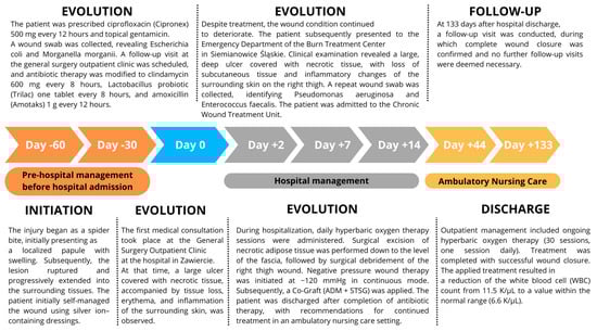 Hard-to-heal wounds remain a significant challenge for healthcare professionals, particularly in aging populations. Although most chronic wounds are associated with diabetes or chronic venous insufficiency, rare etiologies should also be considered. One such cause is envenomation by Phoneutria spp. (native to South America, rare in Europe). Their venom contains potent neurotoxins. While systemic manifestations are more commonly reported, localized necrotic skin lesions may also occur. This case report presents a rare chronic wound following a suspected Phoneutria spider bite and highlights the importance of an individualized, multimodal treatment approach. A 61-year-old male patient with a progressive thigh wound following a spider bite sustained during work. Despite initial self-treatment and pharmacotherapy the wound deteriorated. The patient was admitted to the authors’ facility, where surgical treatment included necrosectomy and a sandwich graft using an acellular dermal matrix combined with a split-thickness skin graft. Adjunctive therapies included negative pressure wound therapy and hyperbaric oxygen therapy. After discharge, outpatient wound care was continued. Treatment was monitored with photographic documentation and serial microperfusion measurements. Complete wound closure was achieved after 4 months of specialized therapy. Management of chronic wounds requires a multidisciplinary and individualized approach with surgical intervention, advanced wound care and specialized outpatient follow-up. Full article