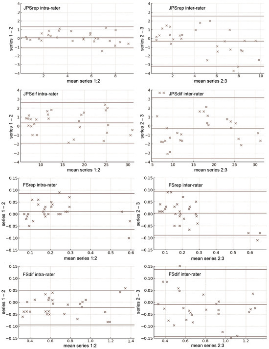 Background: Quantitative assessment of proprioception in children with Developmental Coordination Disorder (DCD) is limited by methodological variability and the lack of developmentally appropriate protocols. Joint position sense (JPS) and force sense (FS) assessments are commonly used in adults; however, their reliability in pediatric populations has not been sufficiently established. The objective of this study was to evaluate the intra- and inter-rater reliability of adapted JPS and FS protocols in children with DCD and to determine whether the observed reliability supports the use of these methods in experimental research. Methods: A repeated-measurements reliability research design was employed. Twenty-eight children aged 10–15 years (mean age 12.86 years), with a mean body mass of 43.68 kg and a mean height of 149.32 cm, and with medically confirmed DCD, completed four proprioceptive tests: joint angle reproduction and differentiation, and force reproduction and differentiation. Absolute errors were calculated for each trial. Reliability was assessed using intraclass correlation coefficients (ICC2,k), standard error of measurement, and smallest detectable difference. Bland–Altman plots were used to evaluate agreement. Results: Reliability across all tests and movement directions ranged from good to excellent. Most ICC values exceeded 0.90, with only a small number falling between 0.86 and 0.90. Although differentiation tasks produced larger absolute errors than reproduction tasks, their reliability remained excellent. Bland–Altman analyses demonstrated acceptable bias, reasonable clustering around the mean difference, and only occasional outliers beyond the limits of agreement. Conclusions: The adapted JPS and FS protocols demonstrated high intra- and inter-rater reliability in children with DCD, supporting their use in experimental research. Full article