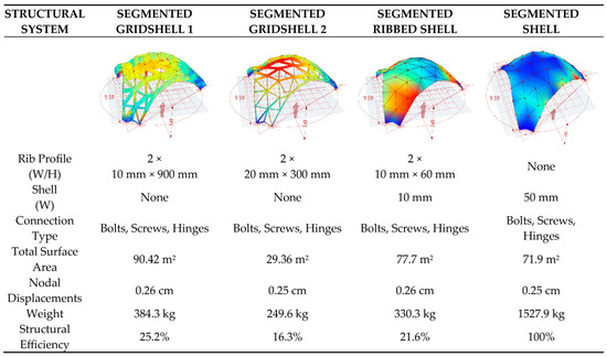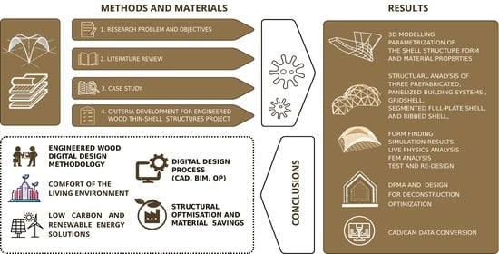 In response to the growing interest in sustainable and material-efficient architectural solutions, this study focuses on innovative applications of engineered timber in lightweight structural systems. It investigates the material optimization and structural performance of engineered timber thin-shell structures through an integrated parametric design approach. The study compares three prefabricated, panelized building systems, gridshell, segmented full-plate shell, and ribbed shell, to evaluate their efficiency in terms of material intensity, stiffness, and geometric behavior. Using Rhinoceros and Grasshopper environments with Karamba3D, Kiwi3D, and Kangaroo plugins, a comprehensive parametric workflow was developed that integrates geometric modeling, structural analysis, and material evaluation. The results show that segmented ribbed shell and two segmented gridshell variants offer up to 70% reduction in material usage compared with full-plate segmented timber shells, with hybrid timber shells achieving the best balance between stiffness and mass, offering functional advantages (roofing without additional load). These findings highlight the potential of parametric and computational design methods to enhance both the environmental efficiency (LCA) and digital fabrication readiness of timber-based architecture. The study contributes to the ongoing development of computational timber architecture, emphasizing the role of design-to-fabrication strategies in sustainable construction and the digital transformation of architectural practice. Full article