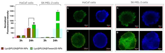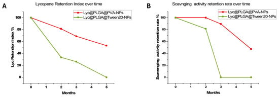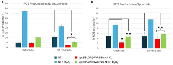 There is a growing demand for plant-derived antioxidants to replace synthetic ones in skincare applications. Phytochemicals are characterized by certain limitations, including poor bioavailability and chemical instability, which affect their industrial exploitation. Tomato peel extract has been used as a source of lycopene, which is renowned for its antioxidant properties. To improve the bioavailability of extracted lycopene, polymeric (poly-lactic-co-glycolic acid) nano-carriers were synthesized by comparing two non-ionic surfactants, polyvinyl alcohol (PVA) and Tween 20. The impact of surfactants has been studied by evaluating: (i) colloidal stability determined by dynamic light scattering; (ii) lycopene retention and bioactivity over time, as measured by spectrophotometric assays; (iii) biological interactions on 2D and 3D keratinocyte and melanocyte cell cultures. It was found that both surfactants enable the formation of stable lycopene-loaded nanoparticles suspensions; however, greater colloidal stability was exhibited by nanoparticles prepared with Tween 20. PVA, on the other hand, provided greater nanoparticle stability in terms of loaded lycopene retention and antioxidant activity. Tween 20 surfactant improves the internalization of lycopene-loaded nanoparticles in human skin spheroids. It was demonstrated that both surfactants provided excellent intracellular antioxidant activity of lycopene. This was observed in keratinocytes, melanocytes, adherent cells, and spheroids, suggesting potential skincare applications. Full article