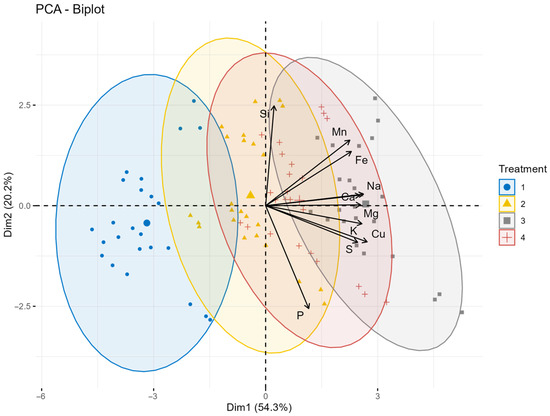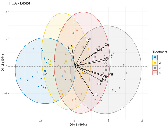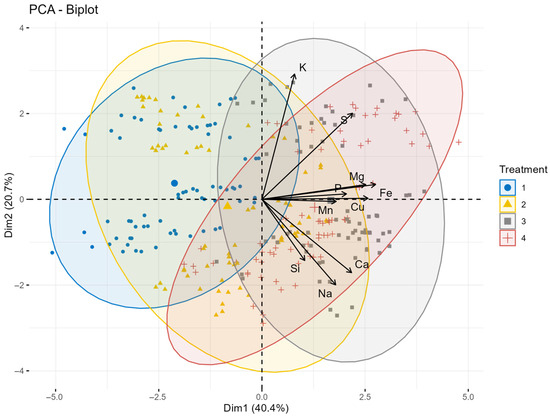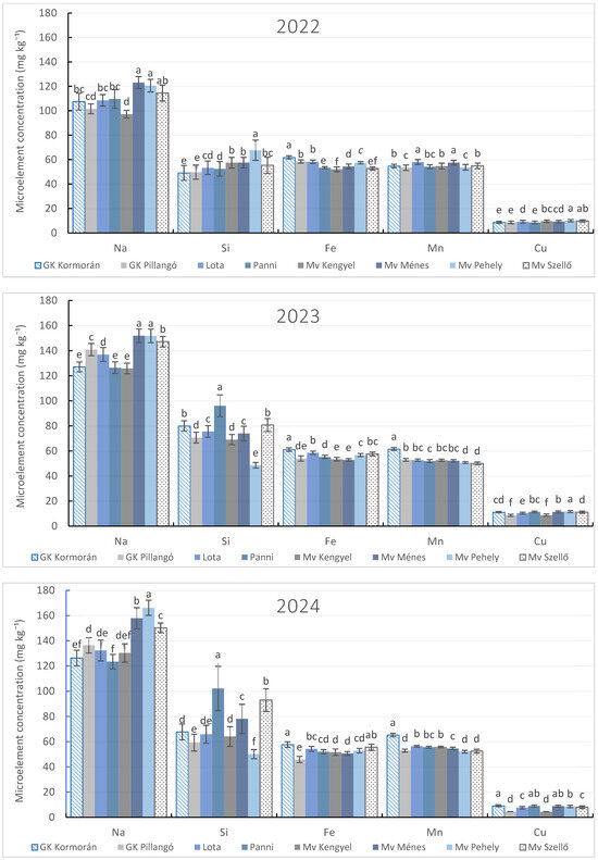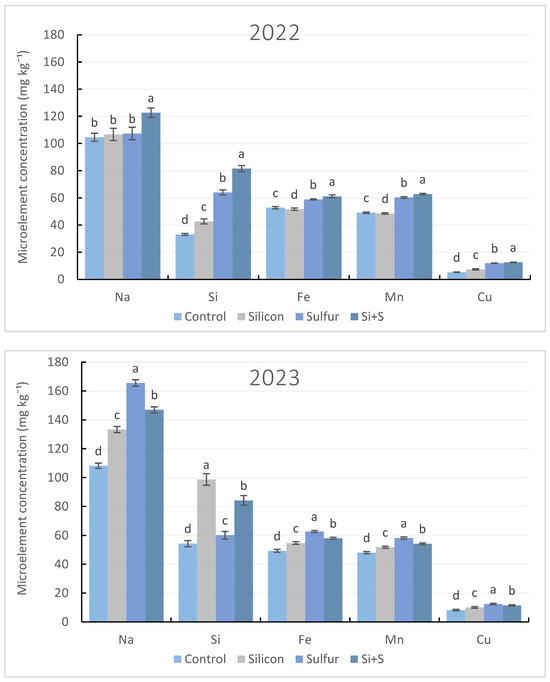 This study evaluated the effects of foliar silicon (Si) and sulfur (S) applications under contrasting climatic conditions on macro- and micronutrient accumulation in oat grain. The three-year field experiment (2022–2024) was conducted in Debrecen, Hungary, using a randomized complete block design (RCBD)with three replications. Grain samples were analyzed for macroelements (K, P, S, Mg, Ca) and micronutrients (Na, Si, Fe, Mn, Cu). Environmental conditions markedly influenced nutrient accumulation. Severe drought promoted the highest concentrations of K, S, and Mg, while mild drought significantly increased the accumulation of P, Ca, Si, Fe, and Cu contents. Moderate drought favored Na accumulation. Foliar S application under relatively favorable water supply significantly enhanced the concentration of all measured elements, with the strongest response observed for Cu (+47.4% compared with the control) and the weakest for Mg (8.5%). In contrast, Si application alone had only limited or negative effects, particularly under severe drought, where it reduced K (6.4%), S (2.4%), and Ca (13%) concentrations, despite increased Si accumulation in the grain. During drought stress, however, the combined Si + S treatment significantly increased the grain macro- and micronutrient concentrations. Among the tested genotypes, ‘Mv Pehely’ exhibited the highest macronutrient accumulation, while ‘GK Kormorán’ and ‘Mv Pehely’ showed superior micronutrient accumulation. ‘GK Pillangó’ and ‘Mv Szellő’ showed consistently lower nutrient contents. These results highlight the importance of genotype × environment × nutrient management strategies for improving nutrient composition in oat grain. Full article