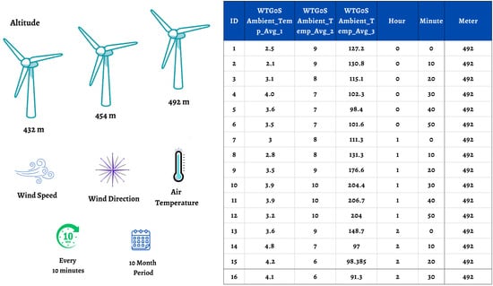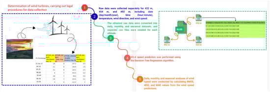 To achieve the highest efficiency from the turbines used in wind power plants, the region where the plant will be located must meet the appropriate conditions. One of these conditions, and the most important, is that the wind potential be above the critical value for energy production and be continuous. Locations that meet these conditions contribute positively to energy production and produce high efficiency. Based on the interpreted data, temperature, wind direction, and wind speed data from three turbines located at altitudes of 432, 454, and 492 m in the Sebenoba area of Yayladağ, Hatay, where wind potential is high, were collected at 10 min intervals between 1 January 2017, and 19 September 2018, yielding a total of 50,986 data points. Wind speed was estimated for this region using temperature, wind direction, and time information. Daily, monthly, and seasonal analyses were used to generate forecasts for the three altitudes. Wind speed was estimated using Decision Tree Regression and 10-Fold Cross Validation methods, and Root Mean Square Error (RMSE) values were found to be 0.64917, 0.66629, and 0.59954 for the three altitudes, respectively; the overall RMSE value was found to be 0.60188. RMSE values decreased in daily, monthly, and seasonal analyses, and an inverse relationship existed between wind speed and RMSE. Analysis of these results indicated that the forecast model was suitable. This study supports sustainability by enabling accurate wind speed forecasting for optimal turbine placement, improving energy efficiency, and promoting long-term environmentally and economically sustainable wind energy planning. Full article