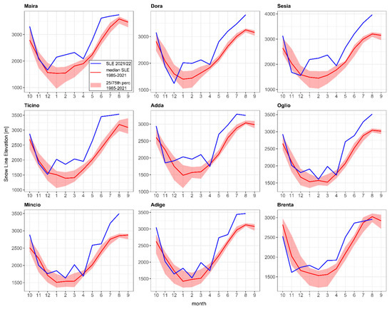 The hydrological drought in Northern Italy in 2022 was, in large part, the consequence of a snow drought in the Italian Alps in the winter of 2021/22 and the resulting deficit of melt water runoff. In this communication, we assessed the snow-cover dynamics in nine Alpine Italian catchments using long time series of satellite-derived snow line elevation (SLE) measurements. We compared the SLE of the hydrological year 2021/22 to the long-term dynamics of 1985–2021. In early 2022, the SLE was located several hundred meters above the expected median values in all of the nine catchments. This resulted in deficits of snow-covered area of up to 83% in the Western Alps (catchment of Sesia, March 2022) and up to 61% in the Eastern Alps (Brenta, March 2022) compared to the long-term median. Although snow-cover data from optical satellite imagery do not contain information about snow depth and water content, in a preliminary qualitative analysis, the derived SLE dynamics show good agreement with the Standardized Snowpack Index (SSPI) which is based on the snow water equivalent (SWE). While the exact relationships between SLE, SWE, and runoff have to be explored further on the catchment basis, long-time series of SLE may have potential for use in drought early warning systems.