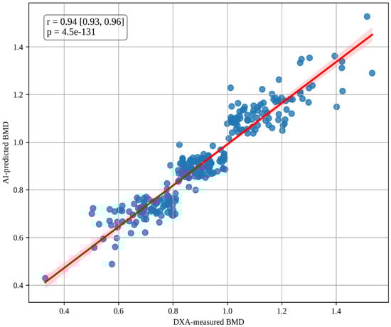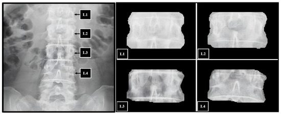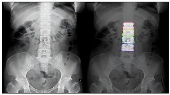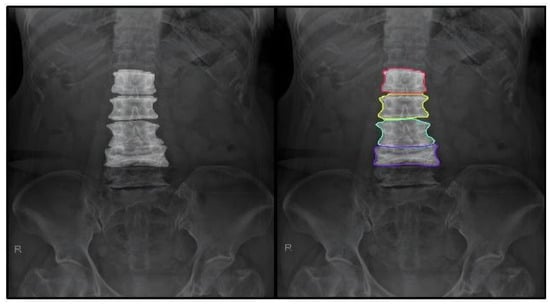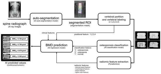 Background: Bone Mineral Density (BMD) plays a crucial role in diagnosing osteoporosis, and early detection is essential to preventing complications such as osteoporotic fractures. However, access to dual-energy X-ray absorptiometry (DXA) screening remains limited in many healthcare settings. Objective: This study presents a fully automated artificial intelligence pipeline for BMD prediction from lumbar spine radiographs to enable opportunistic osteoporosis screening. Methods: The proposed system integrates automatic vertebral segmentation and a machine learning-based regression model for BMD prediction. A YOLO-based instance segmentation model was trained to automatically segment four lumbar vertebrae, achieving a high Intersection over Union (IoU) of 0.9. Radiomic features were extracted from the segmented vertebrae to capture advanced image characteristics and combined with clinical features from 2875 female patients. An eXtreme Gradient Boosting (XGBoost) regressor was trained to provide opportunistic BMD estimation. Results: The model achieved a mean absolute percentage error (MAPE) of 6% for BMD prediction. A classification model built from segmented vertebrae distinguished between osteoporosis, osteopenia, and normal bone with approximately 90% accuracy. Strong agreement between predicted and ground-truth BMD values was confirmed using Pearson correlation coefficient and Bland–Altman analysis. Conclusions: The proposed fully automated system demonstrates strong agreement with DXA measurements and potential for opportunistic osteoporosis screening in settings with limited DXA access. Further validation and refinement are needed to achieve clinical-grade precision for diagnostic applications. Full article